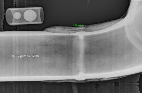 Example: See radiographic profile image which indicates below pipe scab the pipe wall thickness is close to only 1mm of sound metal remaining.